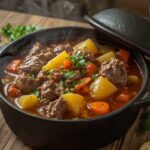 7. Troškinkite apie 1–1,5 valandos, arba kol mėsa taps minkšta, o bulvės ir kitos daržovės sugers visus skonius, bet nepraras formos. Retkarčiais pamaišykite ir, jei reikia, papildykite vandeniu ar sultiniu.